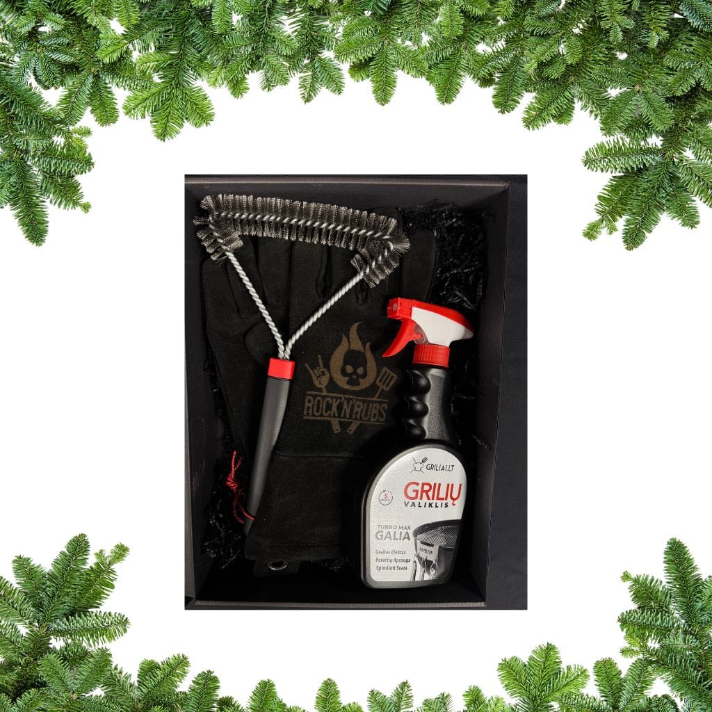 „Švarus grilis – laimingas grilininkas“ – priežiūros rinkinys su valikliu, pirštinėmis ir šepetėliu