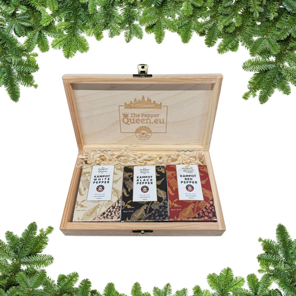 Elegantiškoje medinėje dėžutėje su graviruotu logotipu rasite tris autentiškas pipirų rūšis: